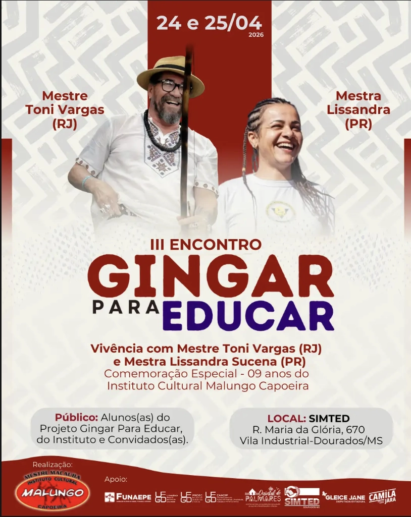 Dourados sediará, sexta-feira (24) e sábado (25), a partir das 19h, o III Encontro Gingar para Educar, promovido pelo Instituto Cultural Malungo Capoeira. O evento integra as ações formativas do projeto desenvolvido em escolas públicas e marca a comemoração especial dos nove anos de atuação do Instituto, consolidando sua trajetória na promoção da cultura afro-brasileira e na formação cidadã.