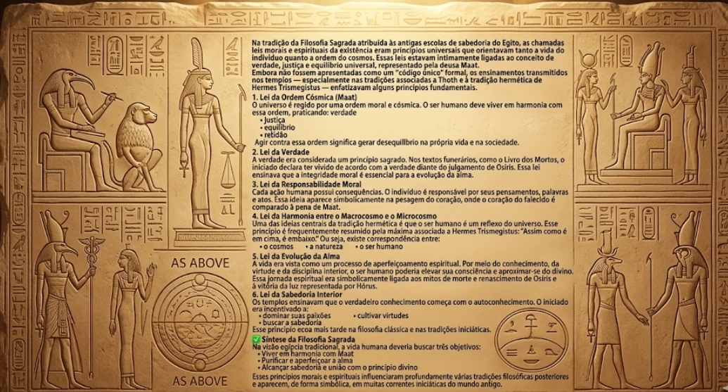 Na tradição da Filosofia Sagrada atribuída às antigas escolas de sabedoria do Egito, as chamadas leis morais e espirituais da existência eram princípios universais que orientavam tanto a vida do indivíduo quanto a ordem do cosmos. Essas leis estavam intimamente ligadas ao conceito de verdade, justiça e equilíbrio universal, representado pela deusa Maat.